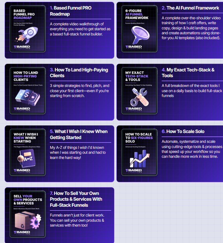 课程拆解:从零到一,手把手教你 这套Based Funnel PRO课程,不是那种听完就忘的理论课,它是手把手实操教学。 这套涵盖30+视频的系统化课程,帮你彻底打通任督二脉: